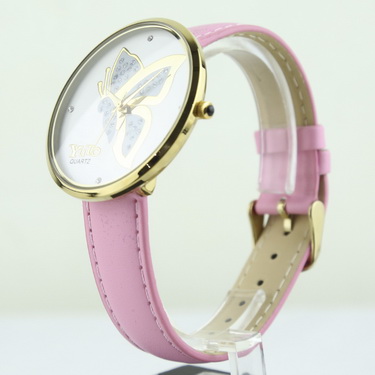 Alloy case with PU leather strap. Mat dial with gold-tone hand. Stones marks at 3, 6, 9, and 12 o’clock positions. The gold butterfly with stones makes the watch alive while wearing. It’s personalized design for women who want to be the eye-catching focus.