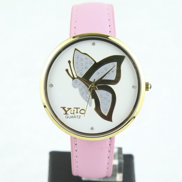 Alloy case with PU leather strap. Mat dial with gold-tone hand. Stones marks at 3, 6, 9, and 12 o’clock positions. The gold butterfly with stones makes the watch alive while wearing. It’s personalized design for women who want to be the eye-catching focus.